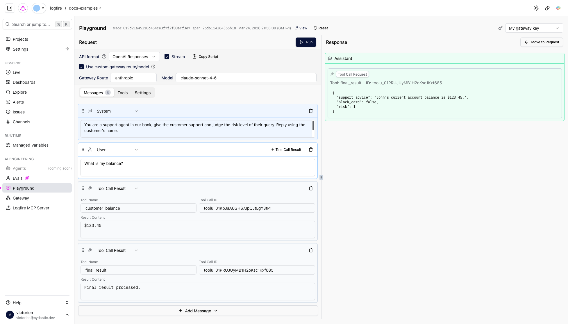 You can then modify parts of the captured run, such as the system prompt, user requests, tool calls, available tools, or model settings, and trigger another run to see the results.